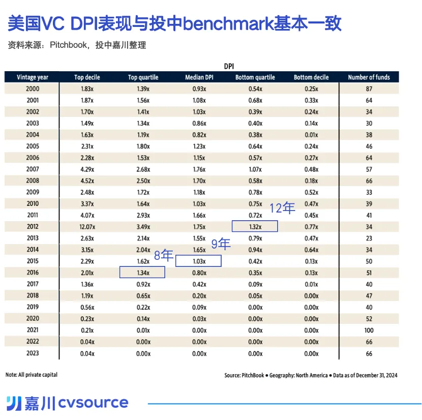 数据揭示了VC/PE行业的基本规律与共同挑战:7年DPI到1是优秀标杆,9年是常态,13年则需警醒。中美趋同的表现证明,长期性是行业基因,而非区域特色。