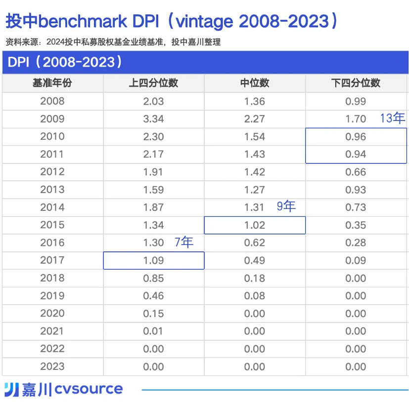 从2024年末数据来看,9年回本是行业大部分基金的表现,而优秀的基金7年DPI能到1。成立5年的基金,优秀的,DPI能达到50%。如果不巧投到了下四分位,请做好心理准备,回本大约需要13年。