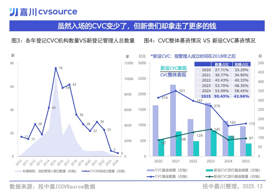 尽管新设CVC的总数在跟随行业大势回落,但那些2018年后成立的硬科技CVC,却实打实地赢得了国资与市场的双重下注。根据投中嘉川CVSource数据,这批硬科技CVC发行的基金数量占比,已从2020年的不足三成(28%),一路增长至2025年的过半江山(55%)。