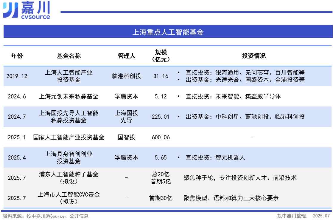 当然了最近上海的动作也不小。浦东宣布设立20亿元人工智能种子基金,重点瞄准创新型人才和尖端技术项目,开创了国资基金AI种子轮投资先河;紧接着上海又在WAIC闭幕会上官宣30亿元人工智能CVC基金,将充分调动上海AI链主企业的力量参与其中。两只基金将为上海AI产业提供更精细化的资本服务。