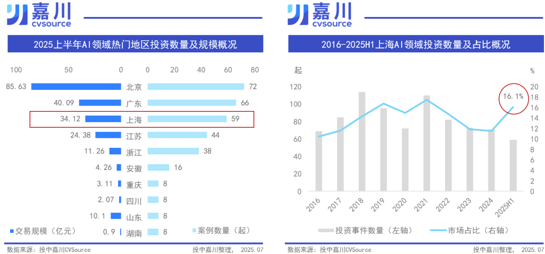 产业资源、资本活水,再加上占到全国约三分之一的AI人才,共同铸就了上海的AI中心地位。投中嘉川CVSource数据显示,2025上半年上海在AI领域投融资规模达34.12亿元,数量达59起,在AI市场中占比回升至16.1%。
