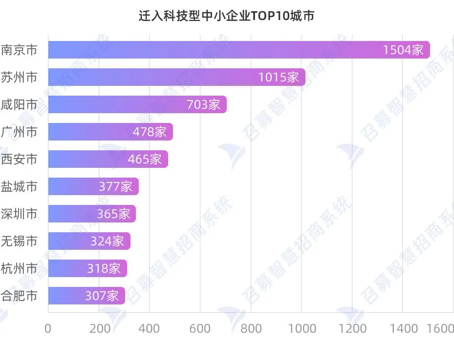 分别是排在第一位的南京1504家,第二位的苏州1015 家,第六名的盐城377家,第八名的无锡324家。(值得注意的是,这条数据的统计口径与省级迁入不同,它不仅包括省外城市的迁入,还包括省内城市的迁移。)几乎占到全国科创企业迁移的半壁江山。