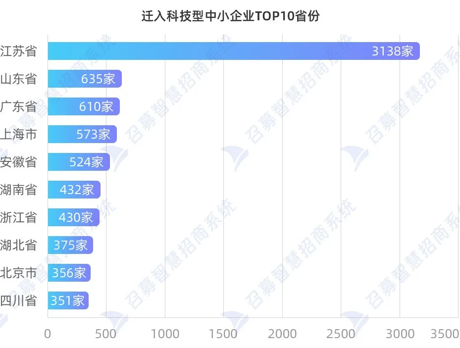 在 2019 至 2023 年5年间,有3138家科技型中小企业从外省迁入江苏省,是全国迁入最多的省份。