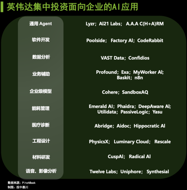 英伟达今年所投的39家AI软件应用中,其中34家重点面向企业客户(见下表)。