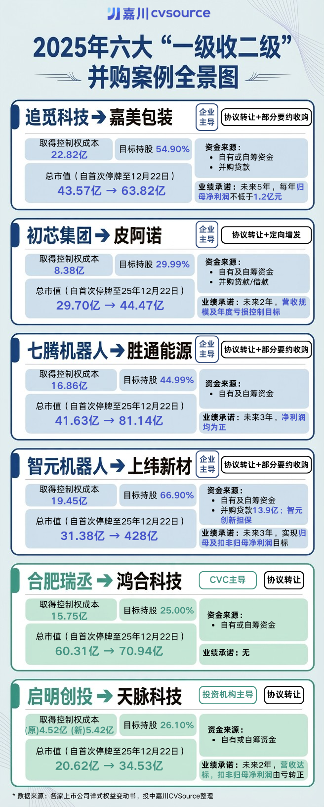 2025年一级收二级案例风靡,由年初的启明收天迈科技,再到前几天的追觅收嘉美包装,不仅收购方背景不同,交易方案也在迭代。我们对比了2025年六笔重要的一级收二级案例方案,发现了7个关键点: